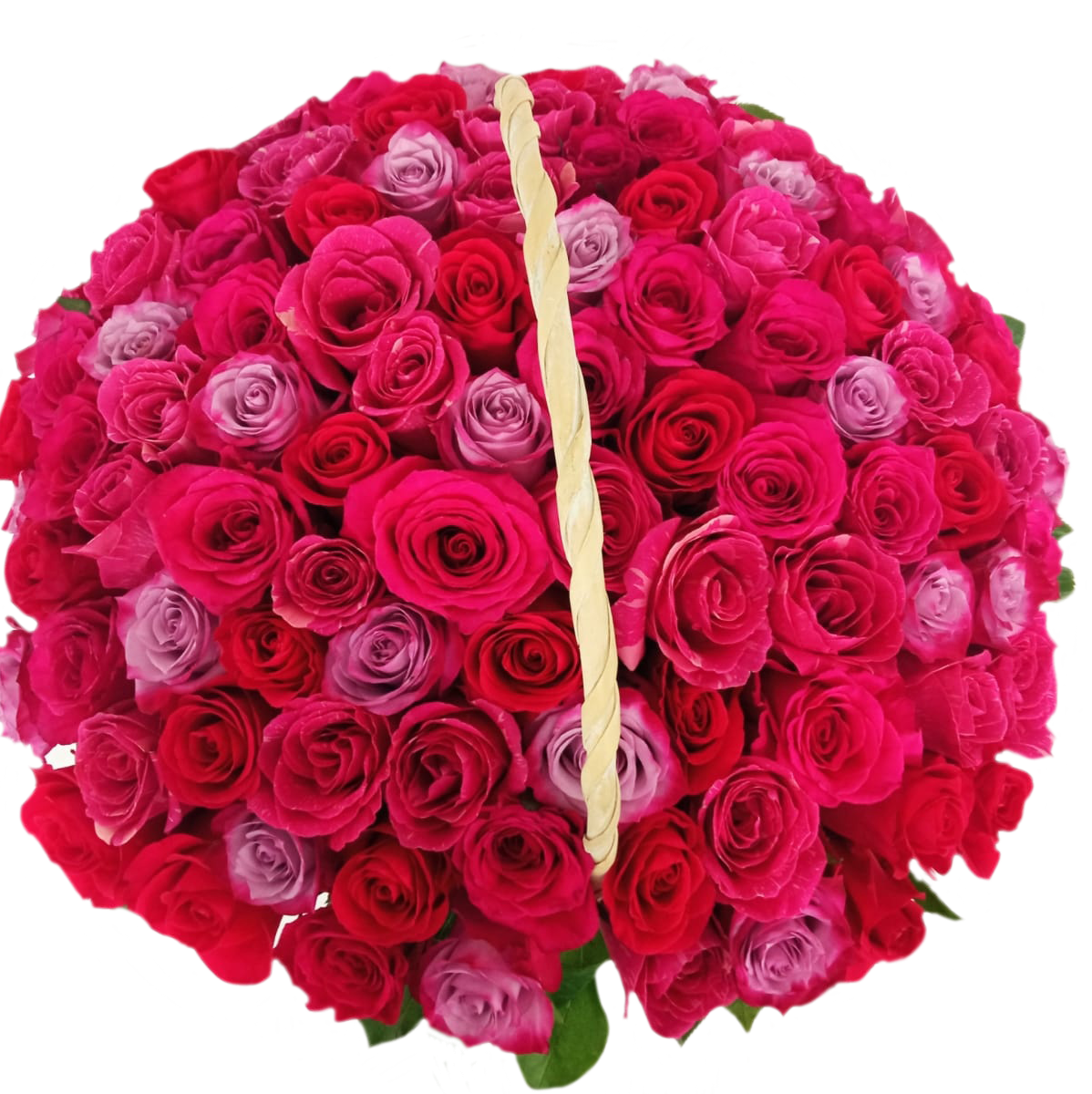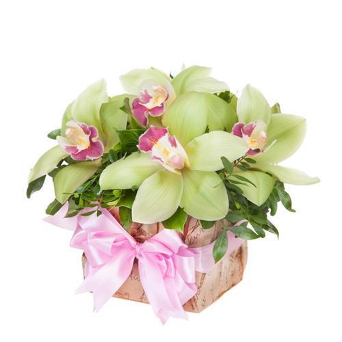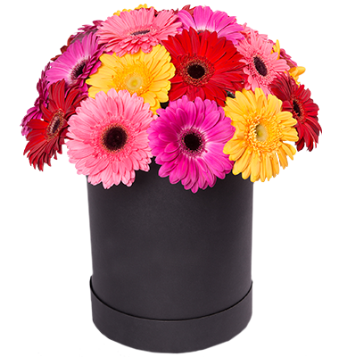 Яркая композиция из герберы и эустомы в шляпной коробке